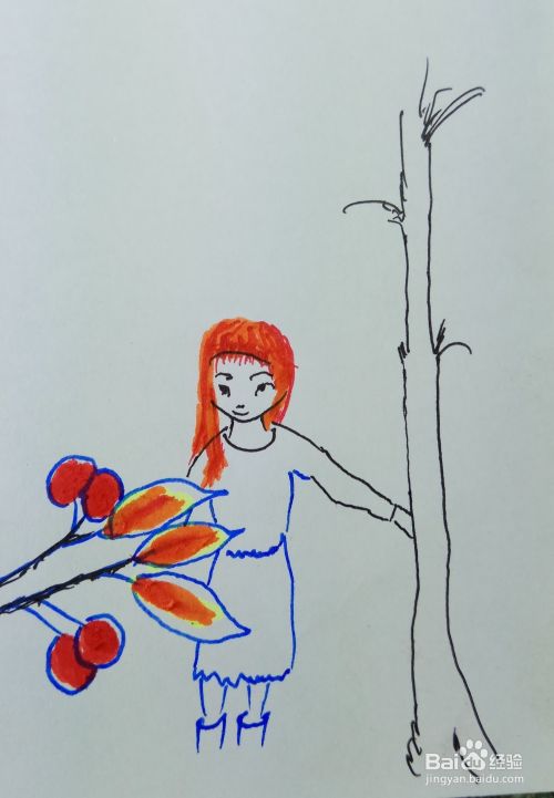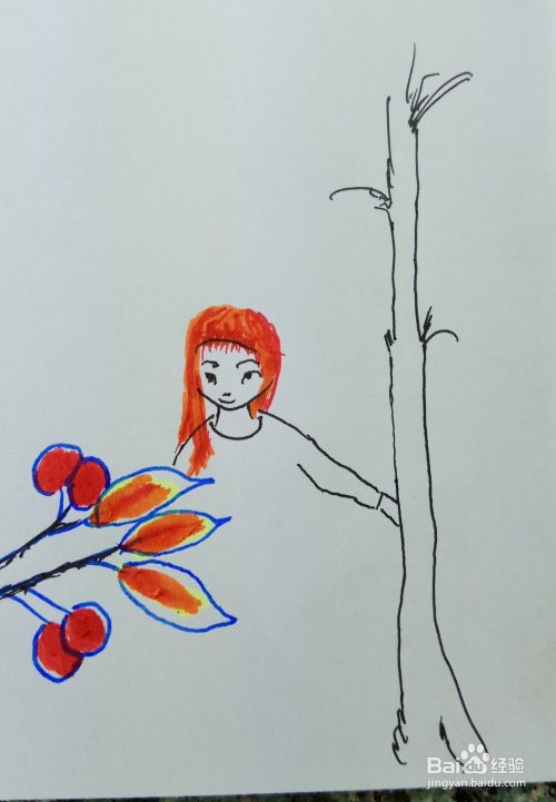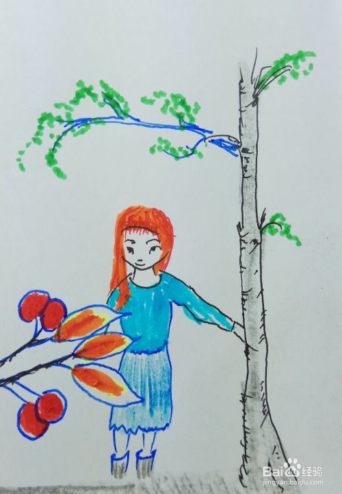 再用线条和曲线画出小女孩的头部轮廓,并画出小女孩的五官和头发,然后再画出她的左手和一棵树的轮廓。