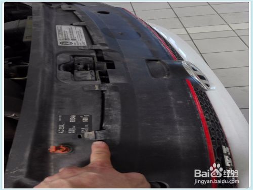 前保险杠的初次拆卸。现在我们可以拆卸前保险杠啦,如图所示,用手把住前保险杠的杠角,然后轻轻地往外掰,这样前保险杠就与车体分离开啦,然后我们将左右两边的雾灯线束插头拔掉。