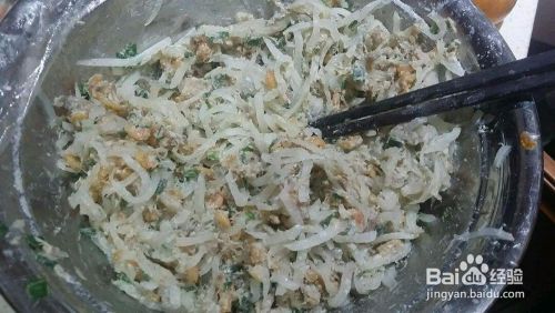 二、待萝卜丝变软时,加入3勺面粉,打一个鸡蛋,再滴入几滴香油,加水进行搅拌,搅拌至食材融合,粘稠