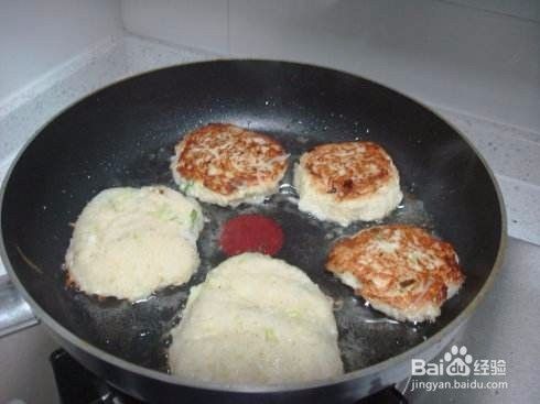 四,不粘锅内加少许油,待油温合适时,用勺子舀一小勺面团,进锅,然后轻轻压成扁圆形。