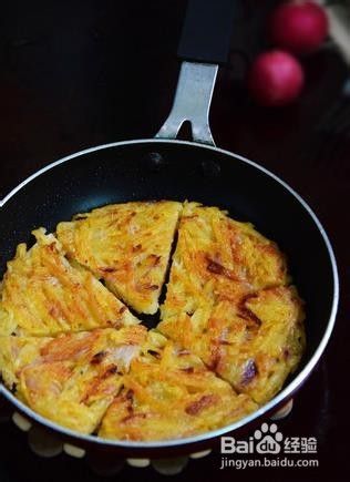 煎锅中倒入油,放入拌好的土豆丝,用筷子拨开成圆饼状,小火煎制