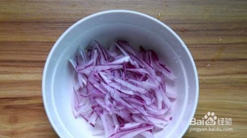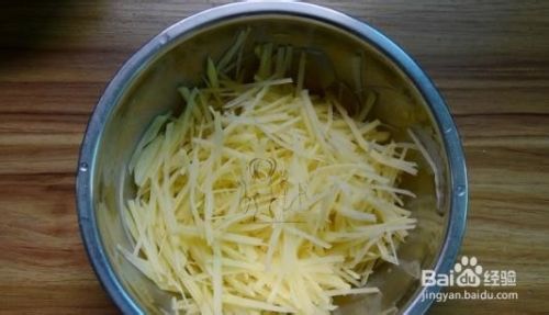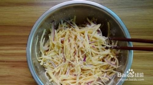 土豆丝、洋葱丝放大碗里,加面粉、盐、辣椒粉、黑胡椒粉