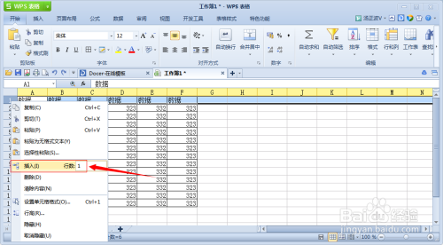 选中表格第一行,然后点击鼠标右键,在弹出的菜单中选择【插入行】数值为1(可以使用这种方法添加行或列,同时也可以鼠标右键菜单中选择删除行或列);