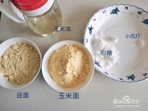 将玉米面,黄豆面,白糖,小苏打混合在一起