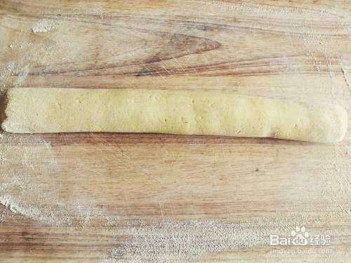 玉米面团醒发结束之后,将面团搓成长条