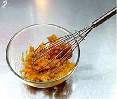 11、先将蒸熟后去皮的红薯用打蛋器或小勺子捣成泥,多搅拌一下,让红薯泥越越细腻越好;