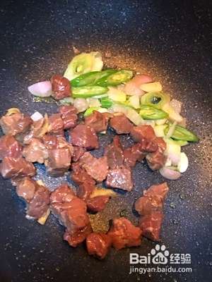 锅中留底油,放入洋葱、青椒、蒜瓣,呛香加入牛肉大火爆炒,变色后改真中小火。