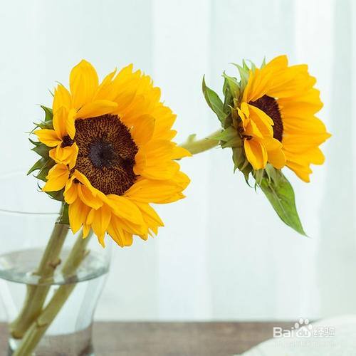 新买回来的向日葵枝茎很厚,但是因为水培向日葵没有根,如果水不能及时补充,植物就会枯萎。为了增加向日葵的吸水能力,要进行倾斜45度角剪切茎部。注意,剪去长度应对比花瓶高度,一般为插瓶后,花头以下花杆露出瓶口6-8cm较为适宜。过长容易导致露出瓶口部分因脱水造成弯头。剪茎后汁水较多,应先将剪切好的茎底部放在开水中大概十秒钟左右,然后放在冷水中浸泡一会儿,可以使它的切口堵塞,防止向日葵的茎中组织液溢出来,造成茎根软化影响花期。