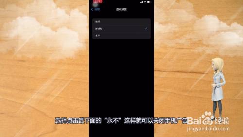 在显示预览界面中,选择点击最下面的“永不”这样就可以关闭手机广告。