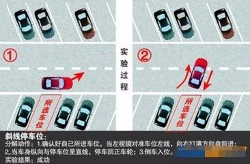 【斜线停车位】当车子直线驾驶到选定车位,右视镜与车位右线对齐,向左打满方向前进,当车身与车位呈直线,停车回正,然后直着倒车入库就可以了。