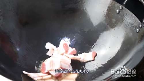 锅中加入适量的油,油热后放入五花肉片炒,炒香后加入适量的豆瓣酱。