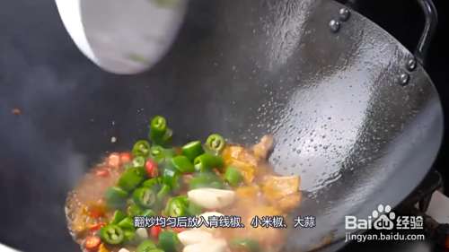 翻炒均匀后放入青线椒、小米椒、大蒜,炒香后放入炸好的杏鲍菇炒。