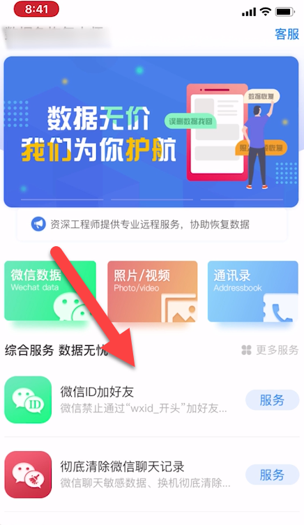 点击微信ID加好友,旁边的服务。