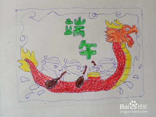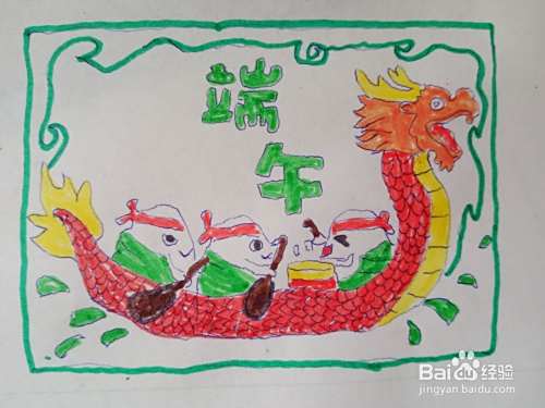 把端午两个字涂绿色,龙舟头,腹部,尾巴涂黄色,其余的龙舟部分涂红色。