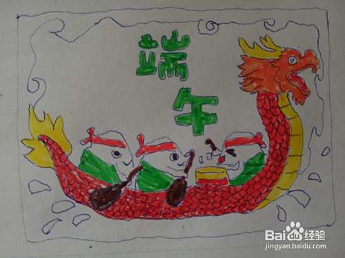 龙舟上画两个划龙舟的粽子,一个敲鼓的粽子。