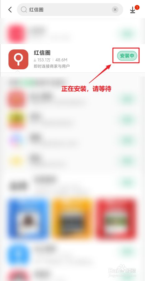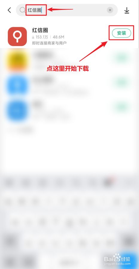 在搜索框中,输入关键字“红信圈”。接着,在搜索出来的列表中,点击“红信圈”右边的“安装”按钮。见下图