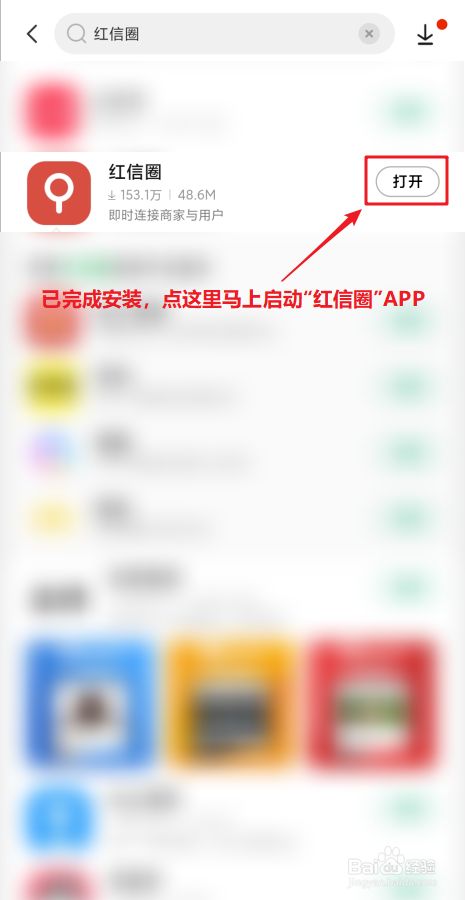红信圈安装完成后,“安装中”变成“打开”按钮,点击“打开”按钮即可启动“红信圈”APP。见下图