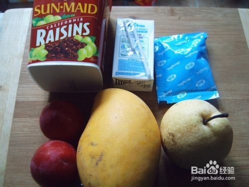4.将水果,葡萄干一起放入大杯子中。