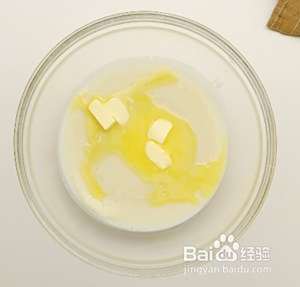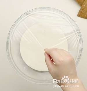 掀开保鲜膜,放入黄油,待黄油融化,用手将黄油揉进面团中,放凉备用。