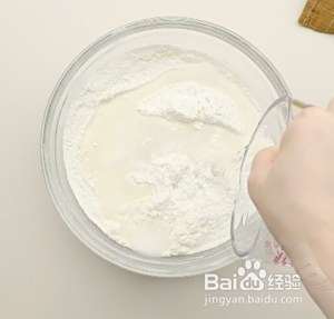 大玻璃内依次倒入糯米粉、玉米淀粉、糖粉,拆开一条永和纯豆浆粉,倒入碗中,用蛋抽混合一下粉类,然后加入清水,用刮刀翻拌混合均匀,然后将面煳过一遍筛。