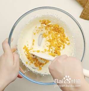在软化的奶油奶酪中倒入豆浆液,用电动打蛋器低速搅打均匀,加入压碎的咸蛋黄,翻拌均匀。