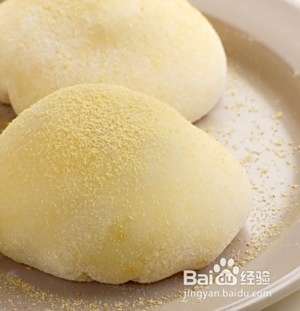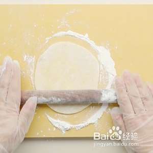 取一小块面团,撒上熟的糯米粉,揉圆,擀大擀平 放在手上。