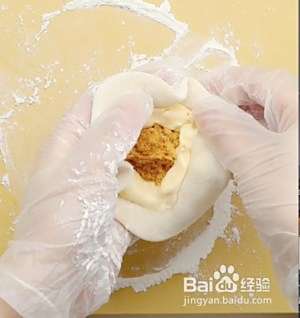 放入一勺咸蛋黄奶酪馅,压平一点,放入适量肉松碎,然后将面皮包起来,收紧收口即可。