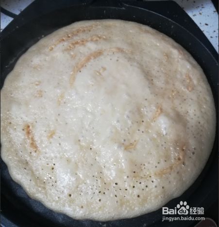 电饼铛刷油烧热,倒入我们制作完成的面粉糊,按照自己洗好做饼的厚度,不过要记得发面饼是会加厚的,所以倒入的量可以稍微薄一些。倒好面糊糊之后,盖上电饼铛,大概2分钟左右翻面。