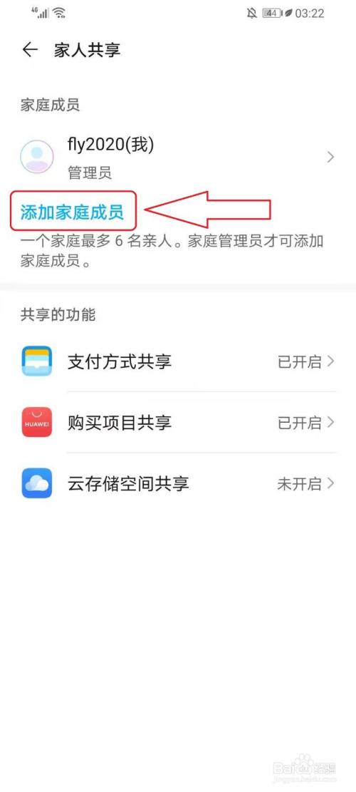 ①、打开家人共享功能;②、设置共享的内容;③、添加家庭成员。