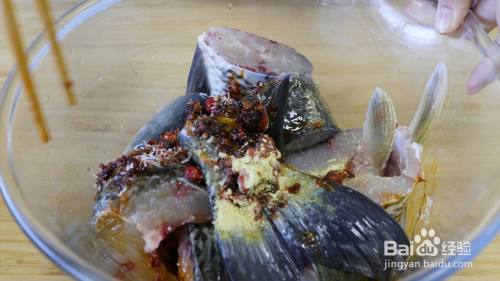 鱼块中加盐、鸡精、胡椒粉、老干妈、生抽、蚝油、料酒,抓拌均匀。