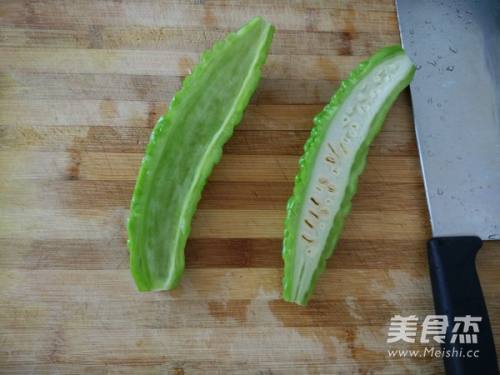 2苦瓜切开、去白瓤,把里面的白色部分尽量清理干净