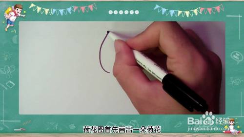 首先,画出一朵荷花,然后在茎上画出四条弯弯的线条。