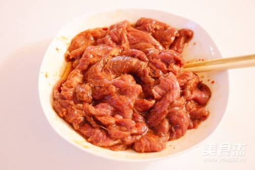 1先将牛肉顺着纹路切成大小厚度合适的牛肉片。加入辣椒酱。