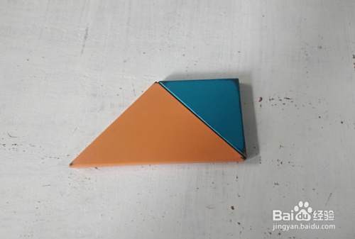 摆上蓝色三角形,放在红色三角形右侧挨着,如图。这样就拼组好了。