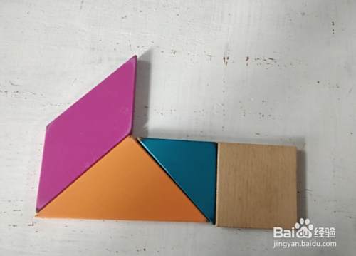 摆上正方形,放在蓝色三角形右侧挨着,如图。