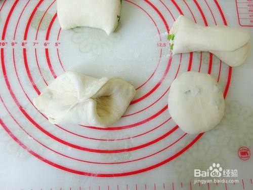 然后再分割成小块,饼的大小都随意,根据自己用的锅选择面剂子的大小吧,我分成了8个小面剂子。每个小块把两端捏严,用手掌下压成方形的饼状,然后对角捏在一起,就简单团成一个圆形了,收口向下放置,这样挨个做好,擀的时候从第一个做的开始擀就行