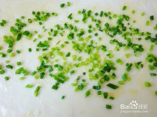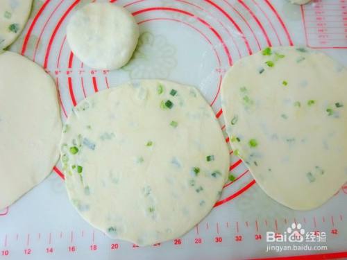 面团擀成大饼状,薄一点层次会多,涂上油酥,撒上切碎的香葱。在拌油酥的时候记得放一点盐搅拌,这样比较会比较均匀