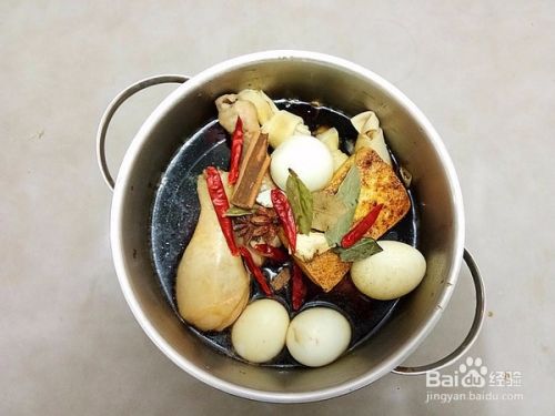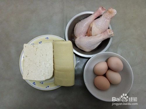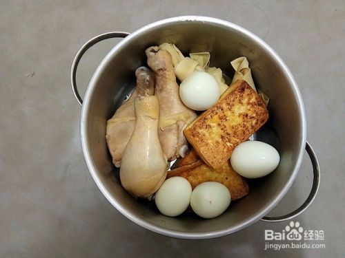 焯过水的鸡腿,豆皮结、煎好的豆腐、鸡蛋一起放入锅中,加入老卤汤和所有调料