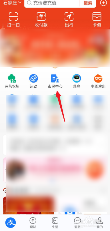 打开支付宝APP,点击市民中心进去。