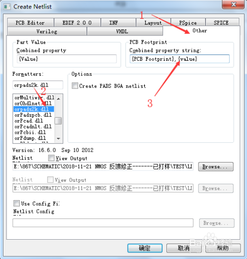 1、首先打开orCAD16.6,选择工程文件,单击工具tool→create Netlist进入create Netlist对话框。导出网表的时候选择other,选择orpads2k.dll,然后在pcb footprint栏加上 ,{value}