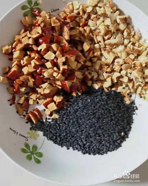 等待发酵的时候,可以把红枣洗一下切碎去核,把核桃也切碎,黑芝麻少许。