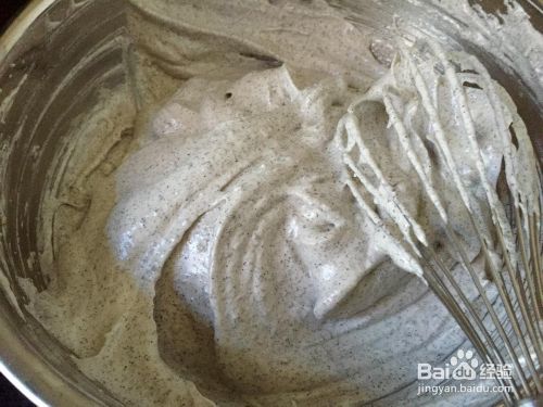 在步骤2中,用刮刀将三分之一的蛋白奶油加入到粗粮糊中,用手动打蛋器搅拌,然后倒入蛋白奶油碗中。先用手动打蛋机按抄底、升降技术(参照小河老师的技术)混合,再用刮刀完全混合;