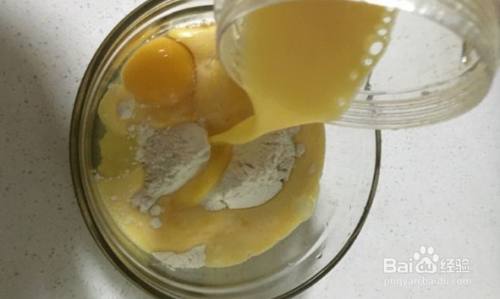 把面粉、鸡蛋和打好的橘子汁搅拌在一起。