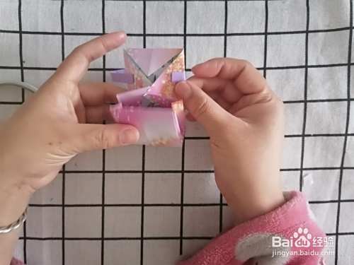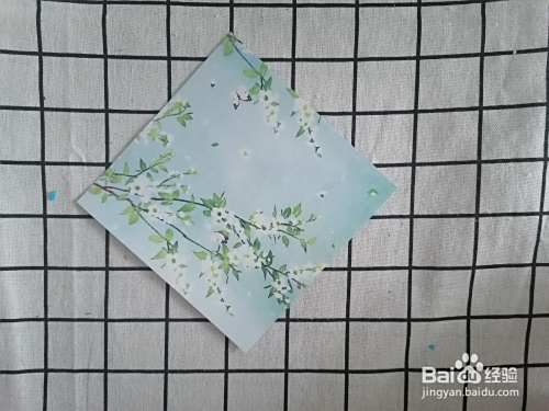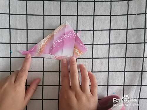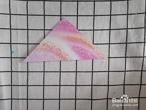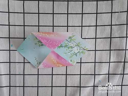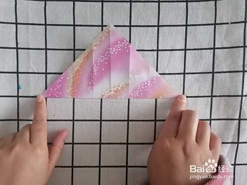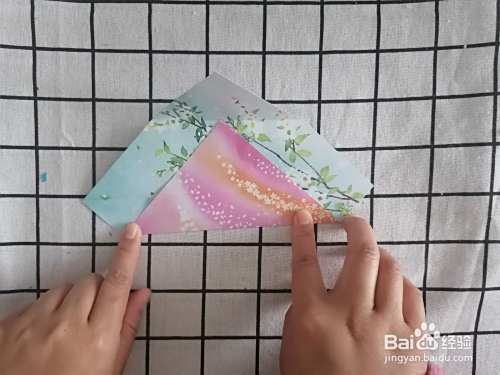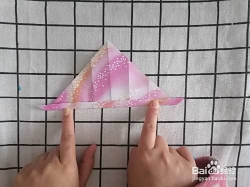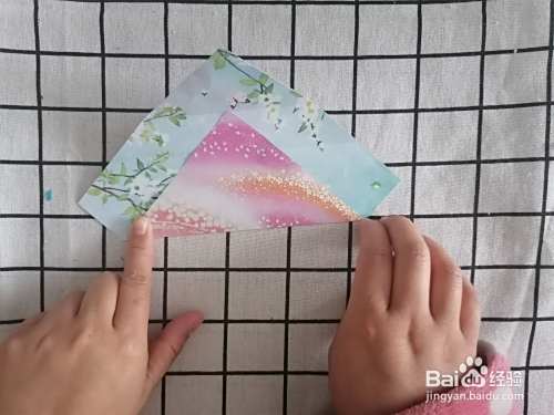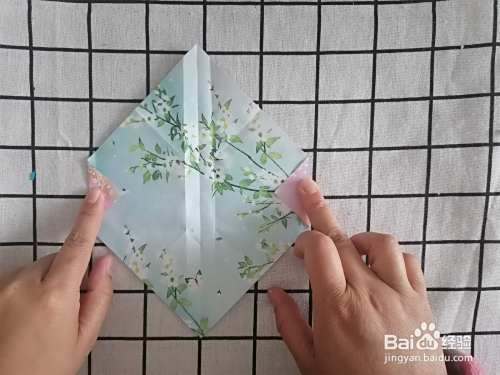 正方形彩纸下面的角向上折叠,如图所示,折出折痕为下一步骤做基础。