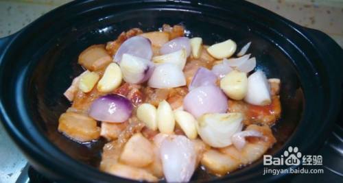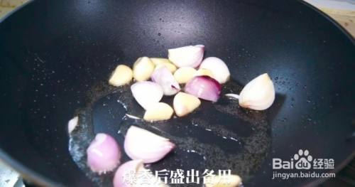 锅里先爆香干葱头和蒜粒,爆香后盛出备用