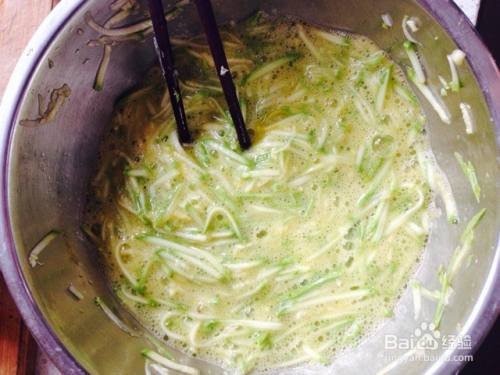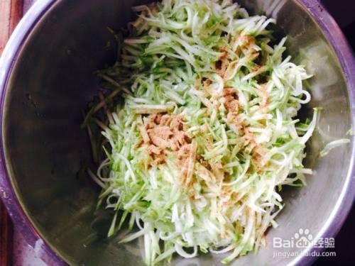 西湖擦丝完毕,加入少许盐,十三香调味,搅拌均匀。西胡很嫩会出很多水。所以千万不要加水哦