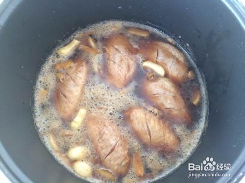 鸡翅以及配料全部倒入电饭煲,加入可乐至鸡翅2/3处,开火