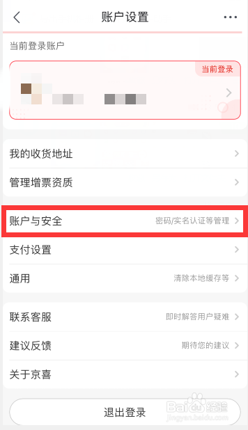 1、打开京喜软件,点击右下角“我的”,点击右上角锯齿轮状的设置图标,点击“账户与安全”