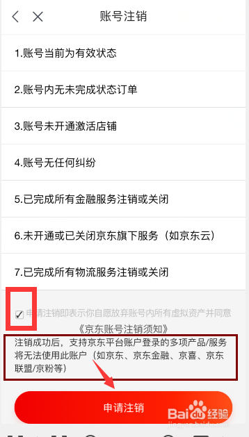 页面上会提示注销账号需要满足的条件,以及注销京喜后,京东平台账户关联的产品也将同时注销,也就是说,京东、京东金融、京喜等京东产品是共用同一个账号,如果注销了京喜,那么使用这个账号登录的其他平台也一并注销了,如果确定需要注销的话,勾选“申请注销即表示你自愿放弃账号内所有资产并同意”后,点击“申请注销”之后,按提示操作即可