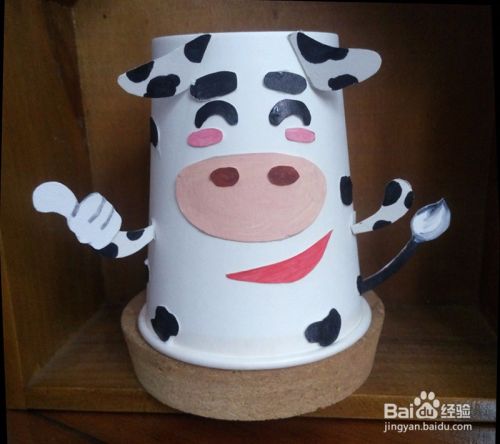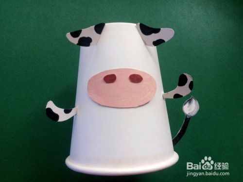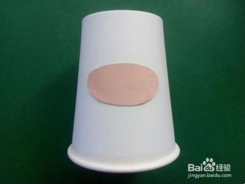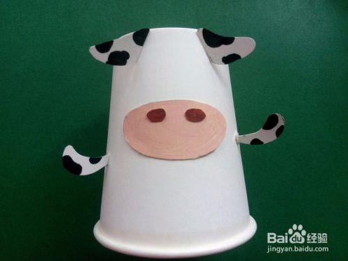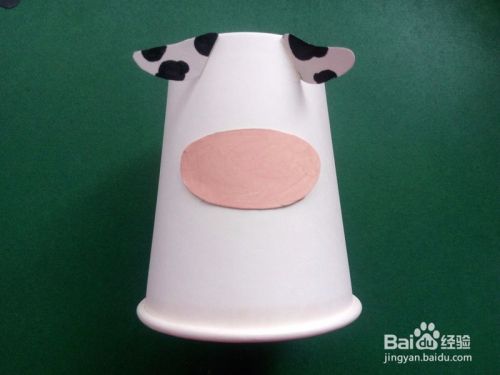 把纸杯倒放,杯底朝上,用胶水把牛的鼻子贴好。
